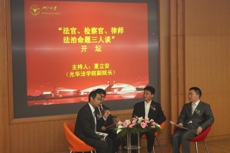 结束时间渐近,场内热情不减,在这与众不同的法家“锵锵三人行”的欢声笑语中,浙江大学第八届法文化月开幕式暨“2009杭州生活品质——平安生活点评发布”和“法官、检察官、律师法治命题三人谈”开坛仪式圆满结束!