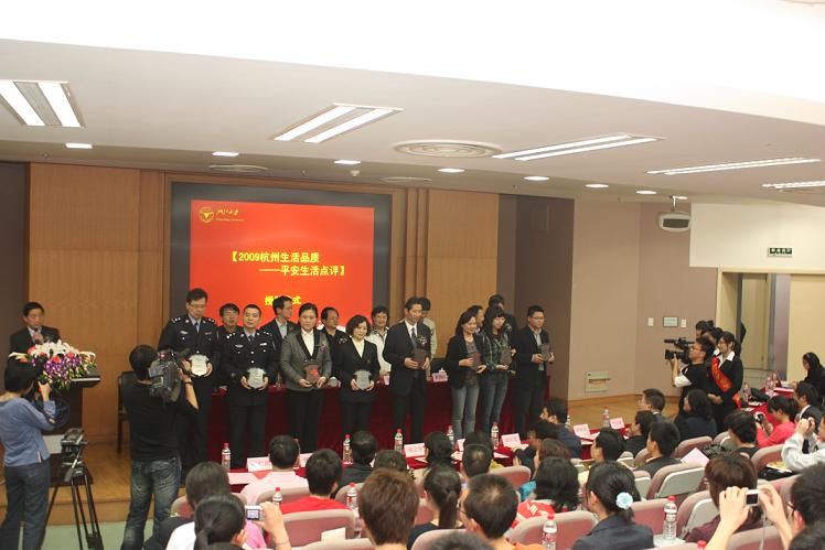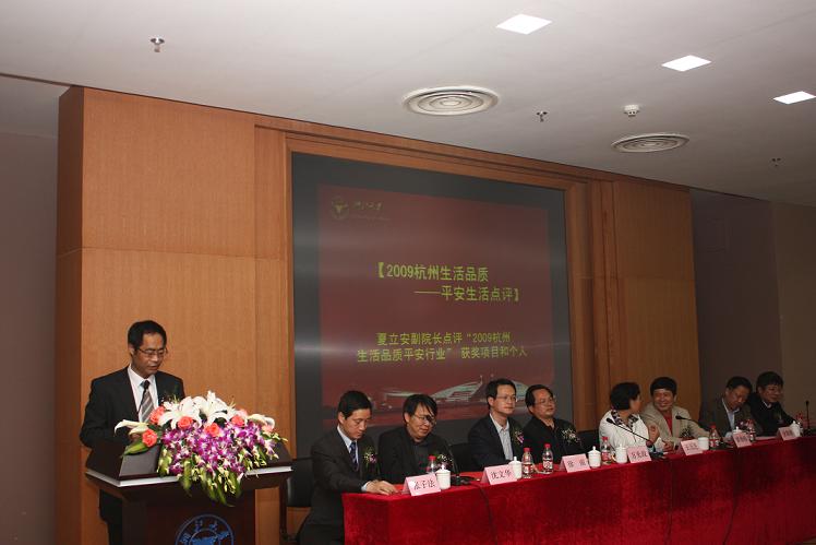 开幕式暂告一段落,“2009杭州生活品质——平安生活点评发布”和“法官、检察官、律师法治命题三人谈”开坛仪式正式开始。2009年杭州平安行业生活品质点评活动是浙江大学光华法学院受杭州市城市品牌促进会委托,由光华法学院副院长夏立安教授主持的重大项目。点评组围绕“生活品质”发展理念,突出“让我们生活得更好”这一主题,立足具有杭州特色的生活文化、城市文化、行业文化、品牌文化,开展“平安”生活行业点评活动。此次发布会的举办亦旨在引导师生关注社会,关心时政,研究创新,在实践中拓展“依法治国,执政为民”的深刻含义和现实意义,配合做好学校进一步推进和完善依法治校的有关工作;敞开人文胸怀,丰富校园文化,营造学术氛围,弘扬法治精神,召唤求是学子以人为本、面向时政的时代激情和社会责任,弘扬学术思想塑造社会的人文关怀和求真务实、经久弥坚的法治精神,为建设法治社会做出贡献。2009杭州平安行业生活品质点评从人物、活动、现象、区块、产品五个方面分别评选出杭州“平安”生活领域的杰出者,杭州市委办公厅万光政副主任发布本次点评名单,具体如下: