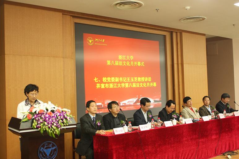 校党委副书记王玉芝教授发表讲话,她高度评价了法文化月活动在促进浙江大学校园文化建设、厚重浙江大学求是明理的人文精神和提高广大师生法律素养方面所起的积极作用。她希望第八届法文化月活动能在构建和谐社会、建设法治国家的方针和科学发展观的指导下,配合学校建设和谐校园、打造平安浙大,从宣传法律知识,传承法学文化,弘扬法学精神入手,以提高学生的综合素质和培养治国之才、强国之才为目标,结合学校宣传部等相关部门的工作职能,发挥光华法学院学生的专业特长,致力于提高学生的法律素质,进一步推进学校的普法教育工作。她亦希望广大同学强化主体意识,积极投身社会实践活动,要主动做到“自我教育、自我服务和自我管理”。以良好的精神风貌和积极的态度为学校的建设贡献属于自己的一份力量,掀起法治校园的新高潮。