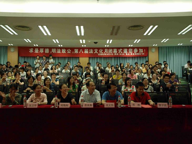 2009年6月11日晚6:30,浙江大学第八届“法文化月”闭幕式暨“今日开庭——全真模拟法庭竞赛”决赛于浙大紫金港校区国际会议中心138室举行。到场嘉宾有校党委宣传部部长沈文华、紫云学园管委会主任、生仪学院党委副书记郑胜、校团委副书记刘艳辉,光华法学院领导有党委书记费英勤、党委副书记张子法。学院团委书记吴卫华、副书记李冬雪、吴文超(挂职)、李鹏(挂职)与光华法学院06、07级全体同学、05级本科生、研究生、博士生代表一起参加了本次盛大的闭幕典礼。