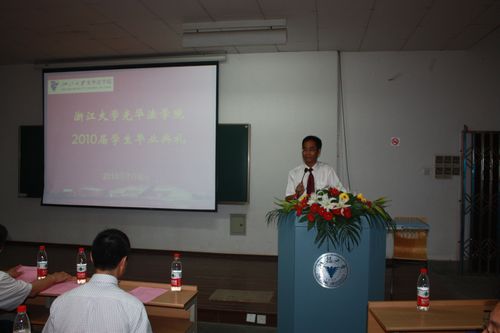 7月6日上午9时,浙江大学光华法学院2010届学生毕业典礼在之江校区曾宪梓楼203拉开帷幕。出席典礼的老师有光华法学院党委书记费英勤、之江校区党工委书记胡炜,法学院党委副书记张子法、吴勇敏,及众位学院领导与众多任课老师,浙江工商大学校长,我院博士生导师胡建淼老师也亲临现场。毕业典礼由夏立安副院长主持,2010届全体本科、研究生毕业生参加了典礼。