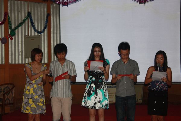 随后,大家为之精心准了多天、付出了许多心血的联欢会正式拉开帷幕。联合会的四个主持人有内地同学也有香港同胞。主持人在进行完开场白之后就进入了表演阶段,首先是“Fall in love队”带来的歌曲串烧,队员们一曲曲开心童歌把在场的老师和同学们都逗乐了。接下来的节目是由“我们队”带来的独唱,一曲动人的《富士山下》撩动了大家的心弦。“Fall in love队”还给大家来了一段十分奇妙的广播体操,可以看出这支队伍为了给大家带来欢乐花费了不少心思。“翼之队”则给大家展示了一段短片,制作之精彩也体现了小组的匠心独运。然后是“之江海盗队”带给大家的精彩小品——唐伯虎与秋香的另类故事。此后的节目也是载歌载舞,精彩纷呈。