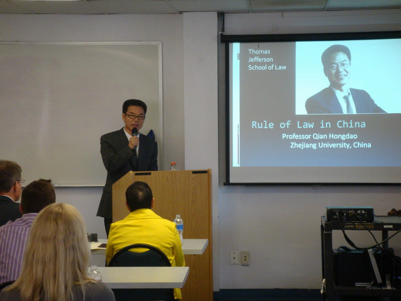 2010年11月10日,钱弘道教授在美国托马斯杰斐逊法学院(Thomas Jefferson School of Law)发表以《法治在中国》为主题的演讲。2010年,钱弘道教授受托马斯杰斐逊法学院邀请,担任客座教授,全学期讲授《法治在中国》课程。这是钱弘道教授主要面对托马斯杰斐逊法学院教职员工发表的公开演讲。演讲活动由全球法律研究中心、国际法研究会主办,资深教授、全球法律研究中心主任Susan Tiefenbrun主持。