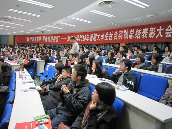 虽然炎热的暑期已经过去很久,但是属于这个暑假里的热度依然没有减退,在11月的浙大校园里传递着温暖。11月22日晚18点30分,紫金港校区蒙民伟楼139会议室座无虚席,在这里,正在举行浙江大学2010年暑期大学生社会实践总结表彰大会。