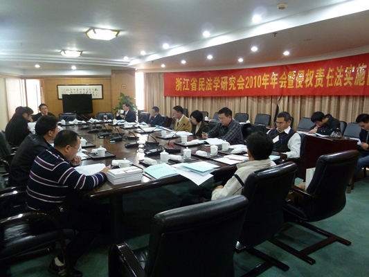 2010年11月25日,“侵权责任法实施问题”研讨会暨浙江省法学会民法学研究会2010年年会在浙江新世纪大酒店举行。民法学研究会理事会成员以及来自全省法律教育研究机构和实践部门的近二十位专家参加了本次年会,并就侵权责任法实施的有关问题进行了交流。年会由会长、浙江大学光华法学院教授陈信勇主持。