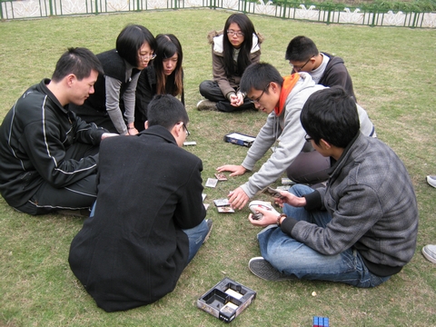 三国杀游戏由于其趣味性以及团队合作性深受同学们的喜爱。而周日下午阳光暖暖清风徐徐,正适合同学们在草坪上“杀上一局”,在紧张的学习之余放松心情增进友谊。