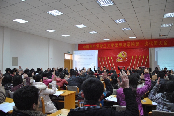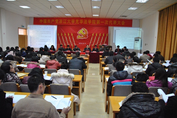 中共浙江大学光华法学院第一次代表大会于2010年12月17日下午在浙江大学之江校区学生活动中心二楼会议厅胜利召开。通过各支部推选产生的100名与会代表肩负着全院党员的重托出席了本次会议。校党委组织部部长张宏建代表学校党委到会祝贺并发表讲话。会议听取和审议了中共浙江大学光华法学院委员会的工作报告、选举出中共浙江大学光华法学院新一届委员会。