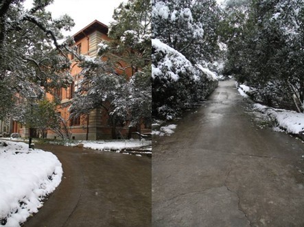 12月16日,雪止天晴,山路已形成薄冰,极为湿滑,为尽快消除冰雪给师生工作生活造成的影响,确保师生在校的安全和便利,之江校区全体后勤人员拿起扫帚,扛着铁锹,开展扫雪铲冰行动,特别对几个重点部位如校区大门口、食堂大门口、宿舍大门口、教学楼各门口、上下山的阶梯等进行了认真的清扫。同时,在各斜坡处铺设草垫防滑。
