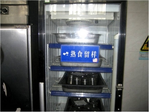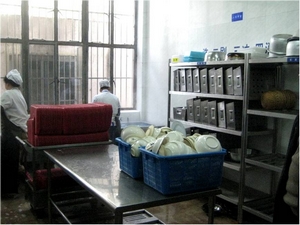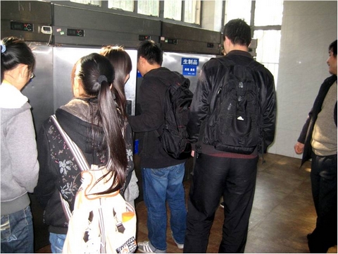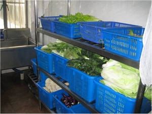 在徐经理的带领下,同学们首先参观了原料仓库,查看原料的仓储情况。由于前段时间社会上“地沟油”事件闹得沸沸扬扬,有同学提出重点查看食堂所使用的食用油。食堂徐经理应同学要求,向同学展示了仓库里的食用油以及相关票据。接着同学们又查看了早上的蔬菜、鱼肉等的进货记录,并对其原料进行了实地查看。