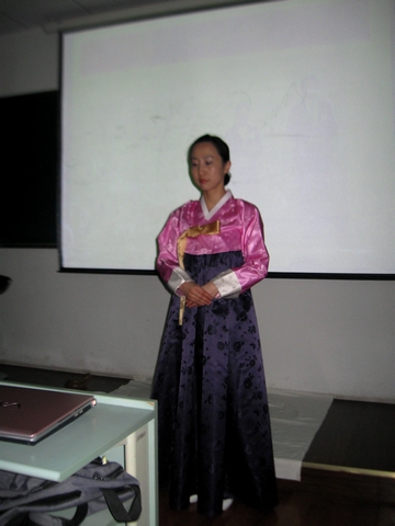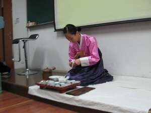 为了活跃现场气氛,丰富活动内容,主讲人又将这两个主要部分细化。在韩国茶道部分,首先介绍了各个年龄阶段韩国男女所穿的各色韩服,在图文并茂的讲演中,为在场的同学们揭示了各色韩服背后的寓意。接着主讲人介绍了韩国人特有的行礼方式,为了让同学们更深刻地领会这些极富民族特色的行礼方式,主讲人亲身示范标准动作,并热情地邀请下面的同学上台参与学习,在欢乐的互动中,在场的同学们初涉韩国别具特色的礼仪文化。