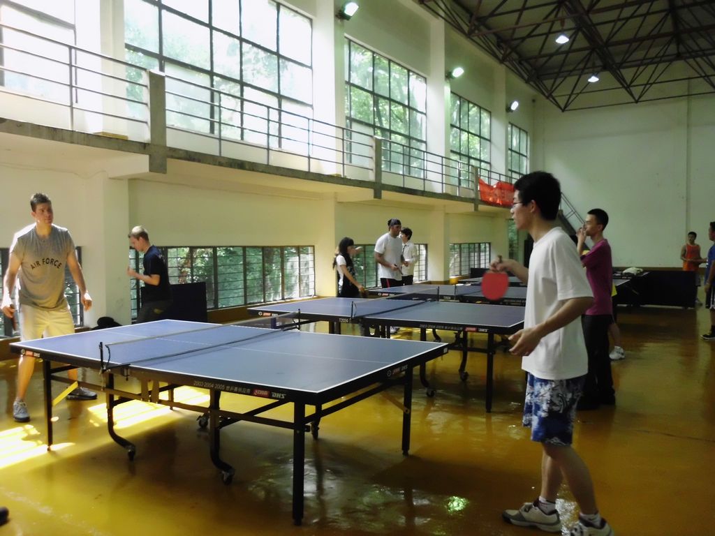 篮球赛后,双方又来到了体育馆,进行了乒乓球的比赛。大家热情高涨,所有桌台均被占满。每一张桌上都是一场精彩淋漓的比拼,异常热闹。激烈的比赛过后,在欢呼声中,光华法学院取得了胜利,也为今年中美两学院的体育交流赛划上一个圆满的句号。