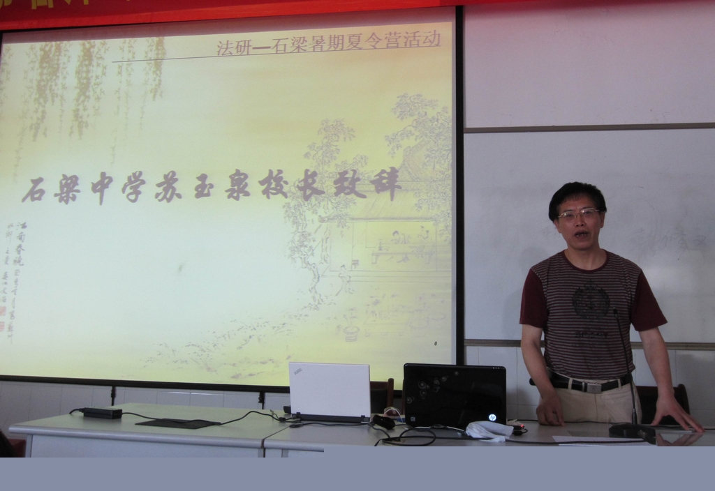 上午9点整,“青春与成长”夏令营启动仪式正式开始,在主持人做了简短的开场白之后,石梁中学苏玉泉校长上台为此次夏令营致辞,宣布浙江大学学生法学研究会——衢州石梁中学“青春与成长”暑期夏令营活动正式启动。