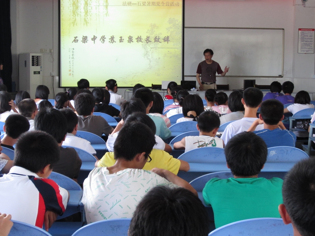 苏校长从衢州石梁中学的发展历史谈起,从一个个生动的故事讲述了石梁中学成为“衢州名校”、“浙江省示范初中”的过程中所历经的艰辛和奋斗。苏校长提出师生通力合作,进一步增强石梁中学软实力的强烈意愿。同时,他对浙江大学学生法学研究会成员的到来表达了由衷的欣喜,对接下去的夏令营活动寄予高度的期待。苏校长讲到,学习不止需要努力认真的学习态度,也需要科学的学习方法,在信心和决心的支持下,石梁中学的发展再上一个台阶指日可待。苏校长也指出,希望浙大学生法研会的同学带给石梁中学学子的不仅仅是形而下的东西,而是更多思想、阅历、视野方面的互动和交流。最后,苏校长表示,此次夏令营活动将会是石梁中学与浙大法研会共同进行的一次有益探索,希望双方能够有更多的合作和开拓。
