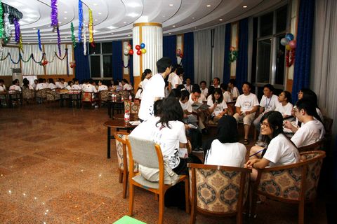 按照安排,所有营员们被分成四个团队,团队的组建极具特色。成员们不仅要确定队名、队歌、口号、而且要选出本队的骨干成员,包括组长、宣传委员、文体委员、组织委员、生活委员和形象大使。任务颇多,初次相识的营员们集思广益、各抒己见。大家或英文或中文,力争用最简短的语言介绍自己,认识彼此。冰块在融化,心灵在靠近,由开始的默默不语到后来的掌声不断,在一种轻松欢快的气氛中各组圆满地完成了团队建设的任务。