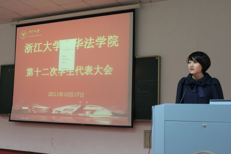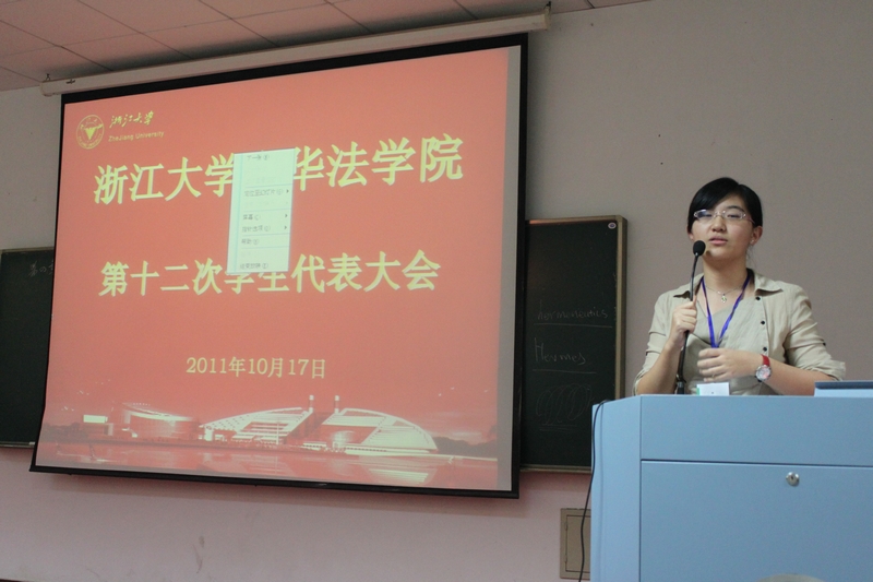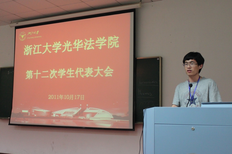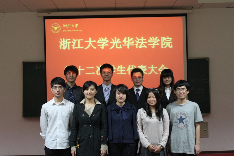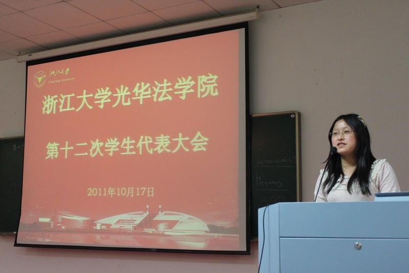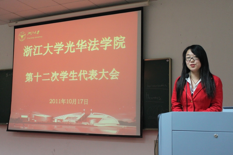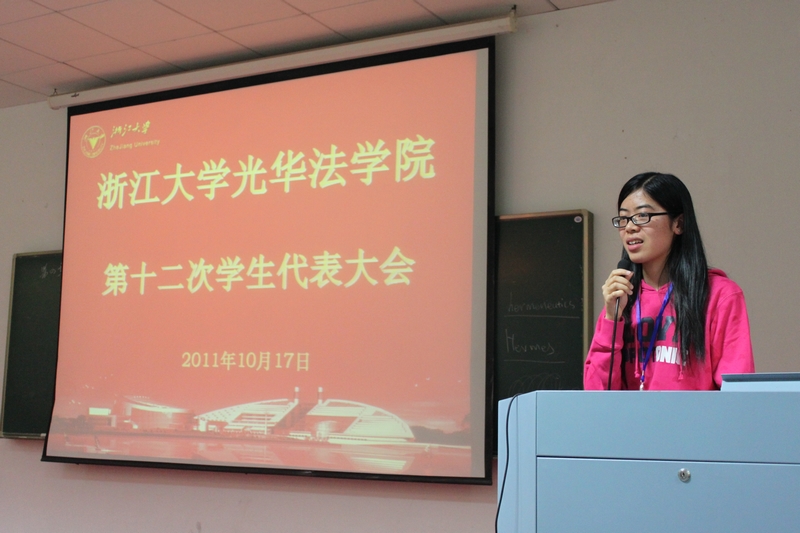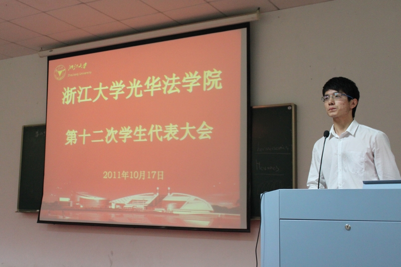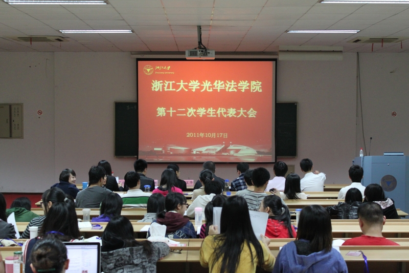 2011年10月17日晚,浙江大学光华法学院第十二次学生代表大会在之江校区曾宪梓楼203举行。光华法学院党委书记、之江校区党工委书记、管委会主任胡炜,学院团委书记吴卫华,团委副书记成晓鹏,挂职团委副书记徐安然,挂职团委副书记马俊彦,学院博士生会主席王侃如,研究生会主席颜萌及60位学代会代表和相关工作人员出席了本次大会。