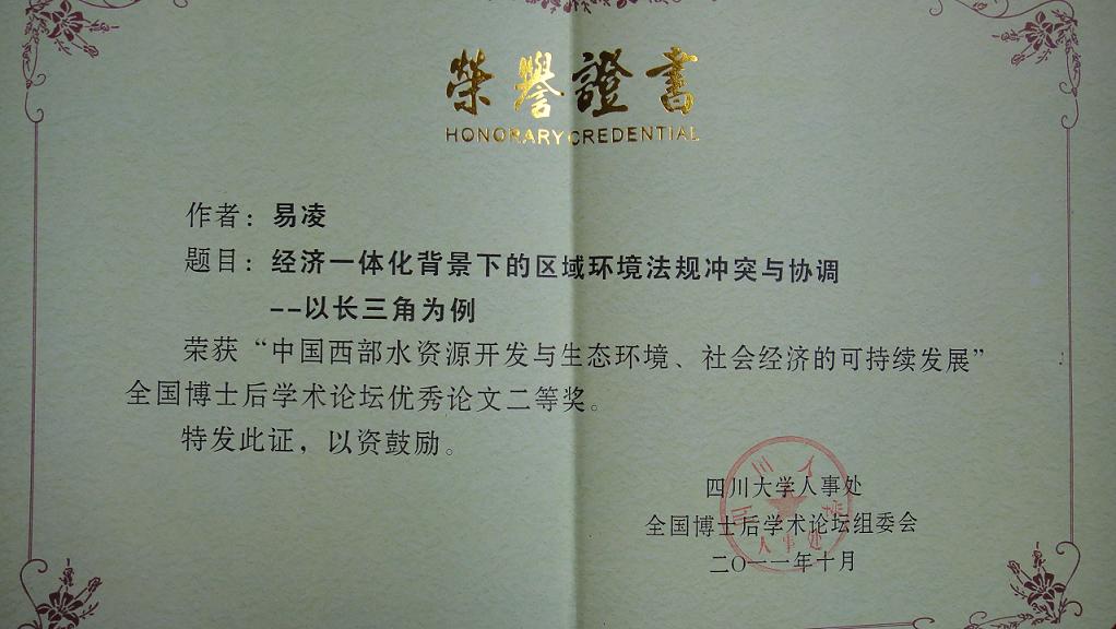 2011年10月27至29日,“中国西部水资源开发与生态环境、社会经济的可持续发展”全国博士后学术论坛在成都四川大学举行。应全国博士后管委会办公室和中国博士后科学基金会邀请,光华法学院法学博士后研究人员易凌应邀参加论坛。