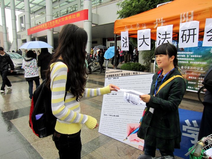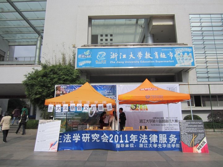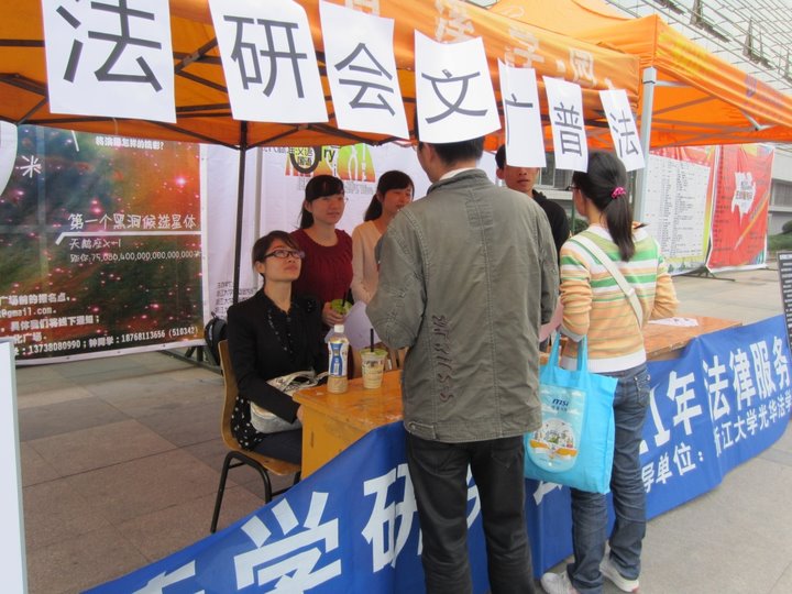 2011年11月18日中午,由浙江大学学生法学研究会举办的2011年法律服务月之文广大型普法活动在浙江大学紫金港校区文化广场顺利举行。本次文广大型普法活动主要围绕刑法修正案(八)、合同法、新婚姻法等问题展开,旨在普及法律知识,提升同学们的法律意识,解答法律疑惑,这也是学生法学研究会致力普法、服务同学的宗旨所在。