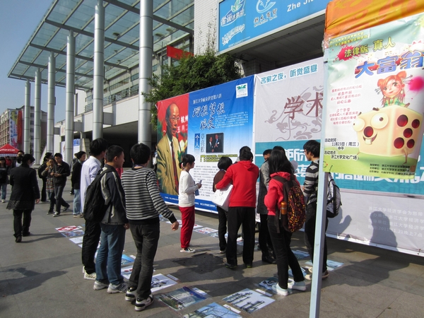 2011年11月23日10:00至13:30,浙江大学学生法学研究会2011年法律服务月系列活动之法律版“真人大富翁”在学生法学研究会各部门的通力合作下于文化广场顺利揭开帷幕。所谓法律版“真人大富翁”,是将“大富翁”这款游戏加以改造,融入法律知识于同学们的日常生活中,并让同学们亲身参与其中的真人版游戏。此次活动旨在改变法律给人固有的枯燥、沉闷的印象,通过轻松、简单的游戏形式向大家宣传和普及法律知识。
