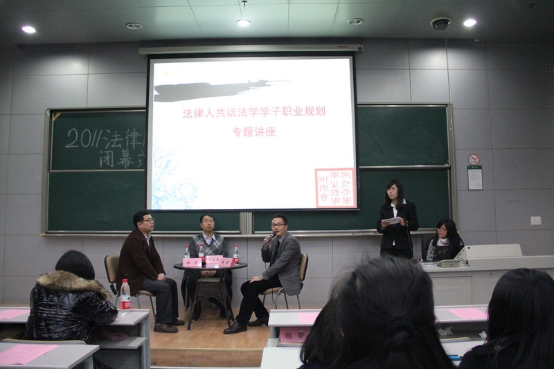 2011年12月10日晚,浙江大学学生法学研究会2011年法律服务月闭幕式在紫金港西一105教室隆重举行。本次闭幕式学生法研会有幸邀请到浙江省高级人民法院马良骥法官、浙江泽大律师事务所钱梁律师以及浙江大学法学院徐进老师一同出席担任主讲嘉宾,与同学们共话法律人的职业人生规划,使整个法律服务月活动在精彩实用的专题讲座中画上了一个完满的句号。