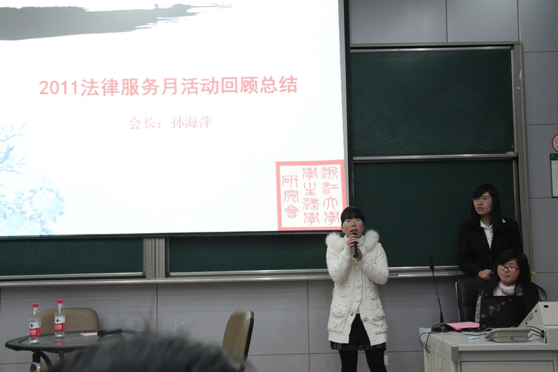 活动最后,学生法研会会长孙海萍同学对2011年法律服务月活动做出总结,并宣布浙江大学学生法学研究会2011年法律服务月顺利闭幕。