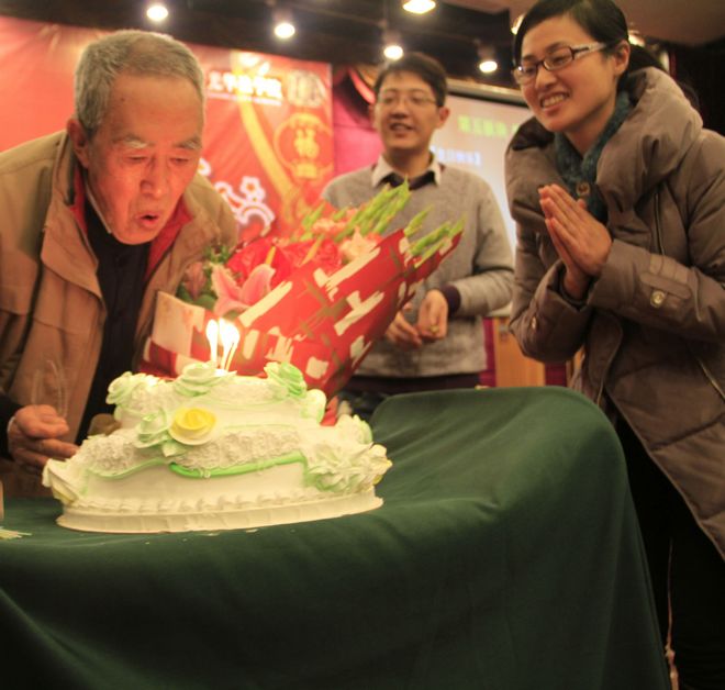 全体人员为退休教师黄汉升老师庆祝80大寿。看到为学院辛勤奉献了一生的老人依然身体硬朗、精神矍铄,现场的新朋旧友由衷地向他表达了生日祝福。老人亦感动异常,欣然表达了希望学院兴旺发达的祝愿。