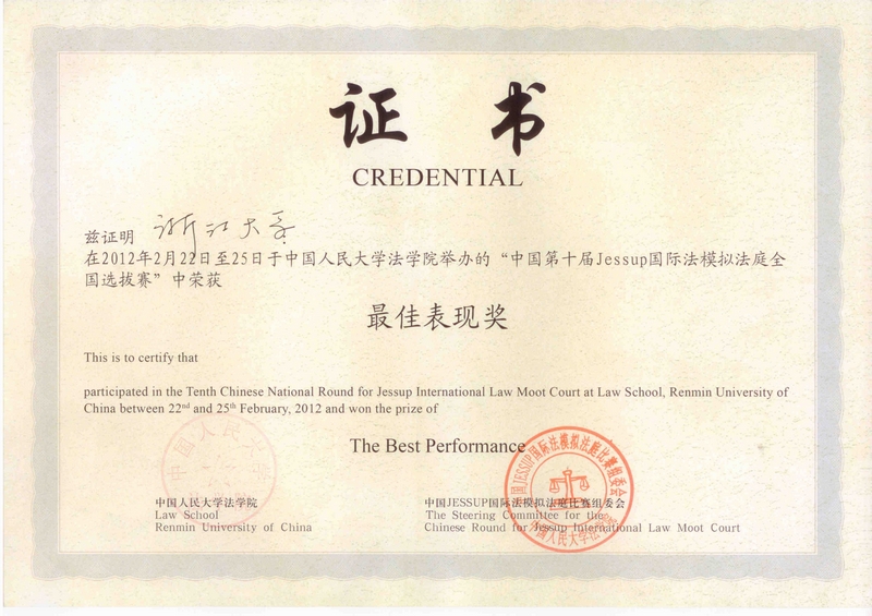 2012年2月22日至25日,中国第十届Jessup国际法模拟法庭全国选拔赛在中国人民大学举行。本届比赛吸引了包括北京大学、人民大学、武汉大学、厦门大学、浙江大学等38所大学的法学院的优秀学子参与。我院由宋永新老师领队,带领6名光华法学学子(冯旭超、程燕、温馨、赵丽红、刘雨�和严晓莹)参加了此次比赛。最终我们浙江大学代表团获得了反方文本第一名、最佳表现奖和团体二等奖的佳绩。