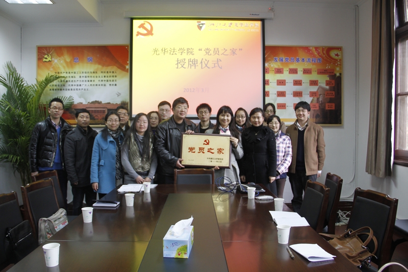 2012年3月15日,光华法学院“党员之家”授牌仪式在之江校区4号楼309举行。浙江大学党委组织部许�副部长、孙棋老师特前来为我院“党员之家”的设立进行授牌。学院党委书记、之江校区党工委书记胡炜,校区党工委副书记胡奎,学院党政办主任林俐,校区管委会办公室主任李志明,组织人事科科长冯利君,研究生党总支、本科生党总支副书记吴卫华,研究生党总支秘书科陈静,本科生党总支秘书成晓鹏等领导老师出席了会议。参与此次授牌仪式的还有兼职辅导员陈益凤,“党员之家”新任管委会主任徐碧纯、副主任梁燕,以及两个“五好”党支部的学生党员骨干。