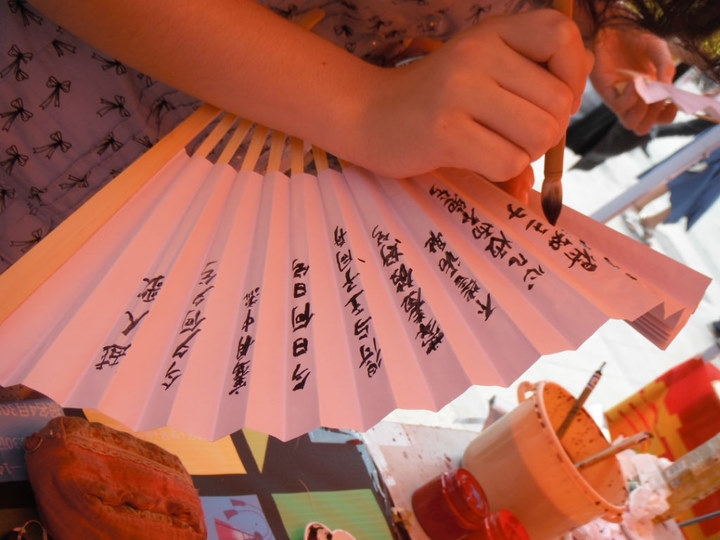 活动中同学们扇面画的形式和内容丰富多样。书法是其中广受大家欢迎的一种形式。“天下为公”、“人生自古谁无死,留取丹心照汗青”等词句都出现在同学们的扇面上,表现出作为浙大学子内心的一份担当和责任。刚入学的12级新同学,在扇面上写下了“浙江,紫金港”五个字,简单朴实的扇面,却承载了他们对求是园生活的期待与向往。活动现场也有同学在扇面上画山水花鸟画。他们会静静地在一旁,构思,然后细心认真地描摹,在热闹的活动现场形成了一道别样的风景。最后呈现在我们面前那优雅宁静的画面,向我们展现了一名浙大学子心境如止水的艺术修养。当然活动中最多的还是简单随心的涂鸦和勾勒。有一位同学在扇面上画了一只可爱的绵羊,当问及她为什么时,她说这是对她来说有着重要意义的动物;有同学花了半个小时的时间认真地把扇面涂得缤纷多彩,折射出这位同学多彩的生活和阳光乐观的心态。活动中每一把扇子,对于它的所有者来说都是珍贵的,因为上面的图案是独特的,回忆是唯一的。