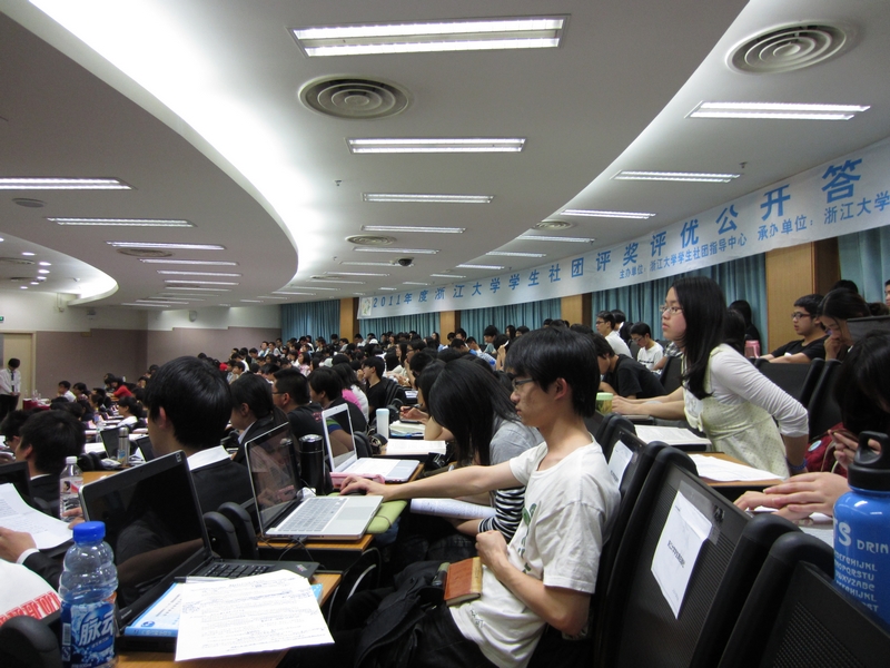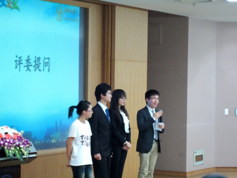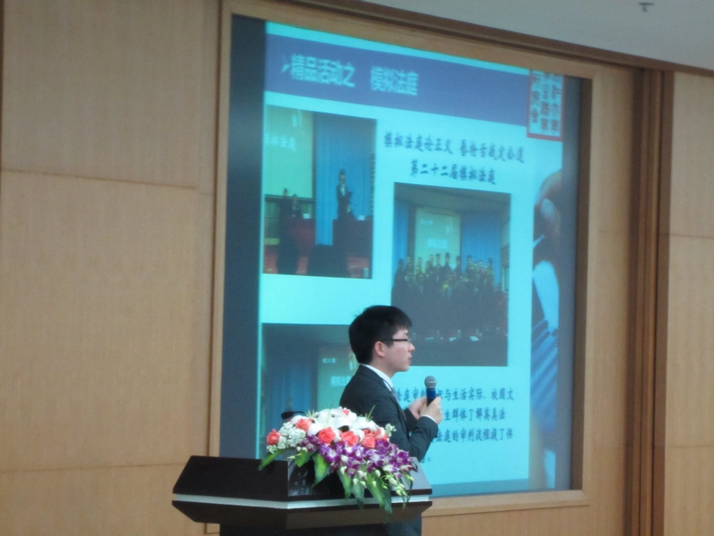4月27日下午,2011年度浙江大学学生社团评奖评优公开答辩正式开始。本次学生社团评奖评优有21家学生社团进入公开答辩环节,同众多的优秀兄弟社团进行答辩评比,对学生法学研究会来说是一次极富挑战的考验。副会长陈嘉龙代表法研会进行了公开答辩,他简洁而详尽的陈述,配合精美的PPT展示,使在场的评委嘉宾和观众们都对学生法学研究会有了全面的了解。在之后的提问环节中,陈嘉龙以学生法学研究会扎实出色的工作为依据,灵活的现场表现,从容不迫地回答评委老师的提问。评委和观众对法研的表现非常赞许。