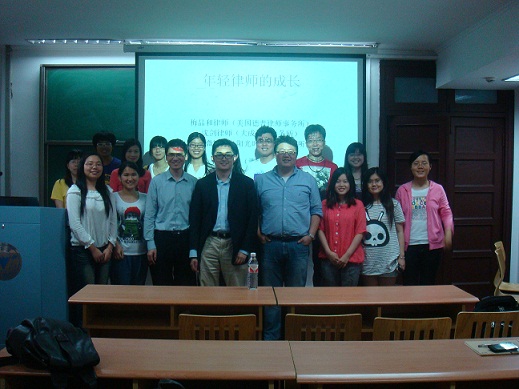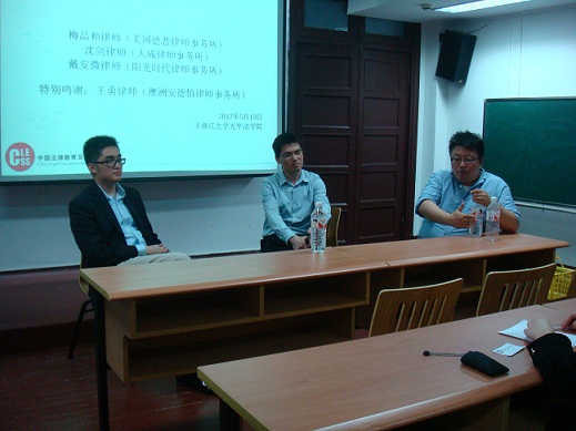 2012年5月13日下午2:00,第十一届法文化月职场导航系列活动暨“年轻律师的成长”分享交流会在之江校区3号楼204教室举行。此次活动是和中国法律教育及就业讲座系列(CLECSS)联合举办。来自美国德普律师事务所的梅品和律师、北京大成律师事务所的沈剑律师和阳光时代律师事务所的戴安微律师,与光华法学院的学子分享了如何从一名法学院学生成长为一名成功律师的宝贵经验。