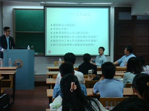 梅品和律师、沈剑律师和戴安微律师一起从律师职业的工作态度、工作要求、法律问题解答、英文写作、信任赢得等五个方面探讨了律师职业生涯中应当注意的一些问题。梅品和律师建议初入职场的同学尽量主动自学,独立解决问题,穷尽一切途径,主动询问指导律师。沈剑律师认为,在工作中要秉持严谨、细致、周到的工作态度,勇于开拓交际面,在律师从业的前期与周围的同事打好关系,为日后拓展客户、独立经营打下良好的基础。戴安微律师则建议初级律师在工作中要保持自信,永远都不要说“我不懂”或者“我没有经验”这样的话,而要通过通读法律、网络搜索、查教材、与政府部门电话讨论、与同事讨论等多种途径来获取信息,解决问题,力求能通过研究问题而最终掌握一个法律领域的知识。