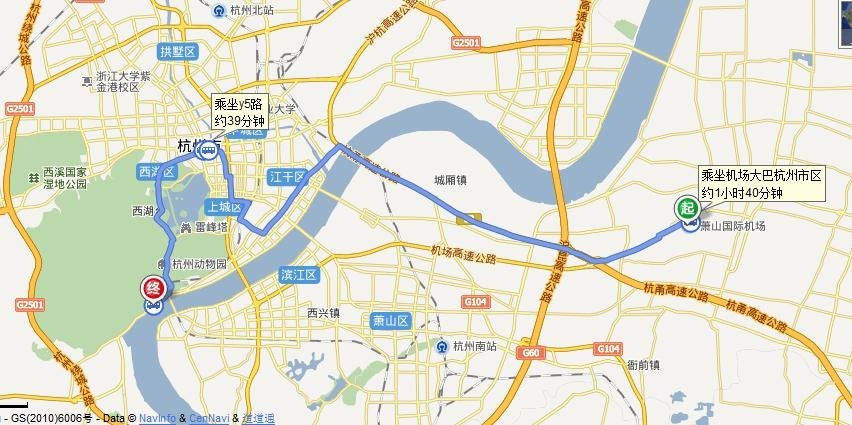 机场大巴+公交方案(Bus Scheme):机场大巴(Airport Shuttle Bus)至杭州市区 → y5路(No.Y5 Bus);全程约3小时 /全程路线长度 47.6公里(About 3 Hours and 47.6 km)。