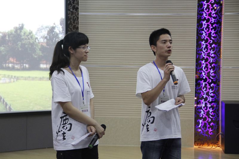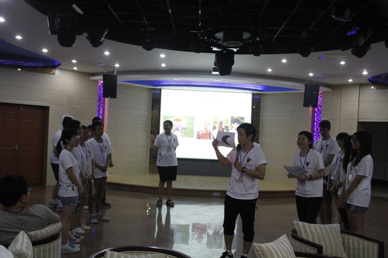 在对浙江大学和之江校区的介绍之后,破冰联谊活动进入核心部分小组讨论以及小组展示环节。夏令营四个小组迅速攻占领地、分划了自己的“势力范围”,或席地而坐或围成一团,组内同学进行了自我介绍、互相熟悉,并经过自我推荐、互相推荐等多种方式,选出了各组组长、组织委员、宣传委员、文体委员、生活委员等骨干力量。在组长的带领下,各组团结一致、发挥组员智慧,对各组组名、口号、组歌、形象大使等的设计以及小组展示的形式等进行了充分讨论。随后,各小组依次上台进行小组展示,第一小组以月轮no.1为组名,寓意大家在月轮山下结缘,并根据歌曲“朋友”的音调改编出了自己的组歌,随后组内各成员进行了自我介绍。第二组组长施丁屹岑手持队名展示牌“closer”,全组以富有创意的T台秀的方式介绍了组内成员,并提出口号:just to be closer,体现了小组的创造力与凝聚力。第三组以包青天的故事引出组名青天月轮,配合英文名black moon,并以狗头铡情景剧的形式生动活泼地展示了自己的组名由来,高喊口号青天不倒、月轮永照,引起现场阵阵笑声。第四组以一对一找朋友的形式细致地介绍了每个组员的姓名、学校,并提出口号one for all,all for one,we are wonderful,给现场营员留下深刻印象。通过小组讨论以及小组展示,各组组员加深了互相了解并迅速建立了友谊,破冰联谊现场气氛活跃、笑语阵阵。