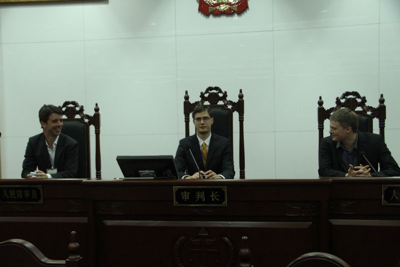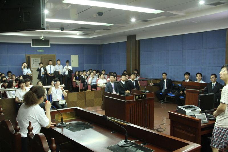 听完了王主任的讲解,我们步入了上城区人民法院最大的法庭。法官在每一名法科学生来心中都具有不可替代的地位。坐在审判长这一神圣的位置之上,触摸着法槌,公平正义的责任亦压上心头。随后我们又来到了小法庭内,听现场工作人员向我们展示如何使用视频设备与看守所进行远程链接,让我们体会到了科技的发展对庭审的影响。
