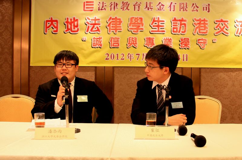 我校学生在整个活动中积极参与,展现了求是学子扎实的专业素养和良好的素质。7月9日的开学礼上,潘添雨同学作为内地学生的代表做了题为“内地法学教育中的诚信教育与道德操守培养”的报告,详细的介绍了我院在进行法律职业道德教育和学生德育培养方面成功的实践经验。7月13日下午,主办方邀请了香港终审法院的陈兆恺常任大法官、香港基本法委员会委员香港大学陈弘毅教授及多位香港法律界知名人士来与实践团成员进行交流,我校学生就香港基本法的实施、香港与内地法律制度的比较、普通法的实践、内地与香港法律合作等多个议题同各位专家进行了广泛交流,期间,我校学生广博的知识面和扎实的专业功底受到了各位专家的称赞。之后的结业礼上,法律教育基金有限公司董事会主席陈小玲女士做了致辞讲话,勉励同学们做到对职业的真正热爱,成为一个有诚信品格与专业操守的法律人。两地学校的学生及老师代表亦就六日来的活动发表了各自的感想。李华老师作为教师代表、吴京同学作为浙江大学的代表分别做了幽默、有力的发言,博得了与会者阵阵掌声。