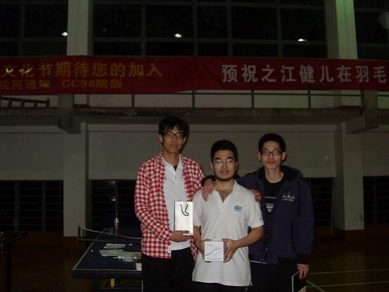 本次比赛分男子单打、女子单打、混双三个部分,单打赛采用淘汰制;混合团体赛采用单循环制,通过抽签的方式分组排序。各路强手在比赛开始就不断涌现,比赛在众多势均力敌的参赛队员之间进行,因而更加精彩。直拍、横拍、扣球、旋转球、弧线球不断上演,喝彩声此起彼伏,特别是温宇寰的单打对抗赛更是引来叫好声不断。之江的参赛选手们在比赛中挥汗如雨,积极拼搏,显示了之江人的铮铮男儿身,不到最后一刻决不放弃。最后,黄思颖、温宇寰在比赛中略胜一筹分别获得女单、男单的冠军,刘昕畅和裴孝亮获得混双的冠军赛。当然比赛中王杲、郑灿、何亦君、张金栋、向淼、魏大颂、张丙强、项丹红、谈文欣、徐逍影、黄芳、项运来等人也是表现突出,你们都是最棒的。本期比赛的另一个亮点就是奖品丰厚哦。作为校园竞技比赛,给之江带来了的快乐,展示了球技,更带来了新的活力,此次比赛不仅为广大之江学子提供了切磋球技的机会,还提供了一个展示自己,不断提高的机会,为今后我院举办类似赛事积累了丰富的经验。