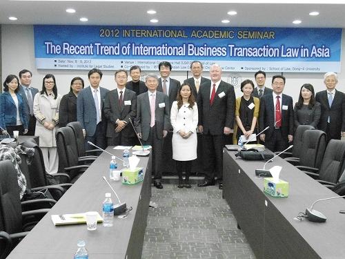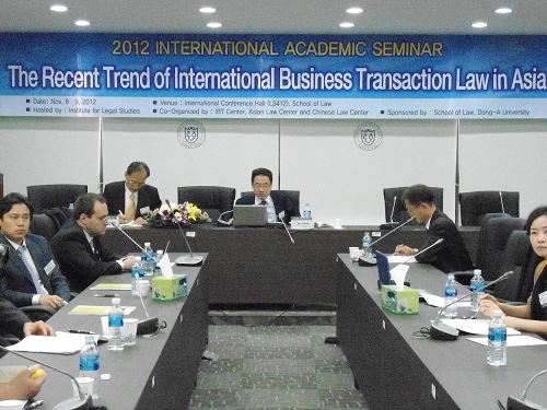 2012年11月8日-9日,韩国东亚大学法学院主办的“The Recent Trend of International Business Transaction Law in Asia”国际学术研讨会在韩国东亚大学举行,研讨会聚集了联合国国际贸易法委员会、越南LCT律师事务所、韩国商事仲裁院、韩国东亚大学法学院、韩国庆尚大学法学院、韩国韩东大学法学院等机构的专家学者。