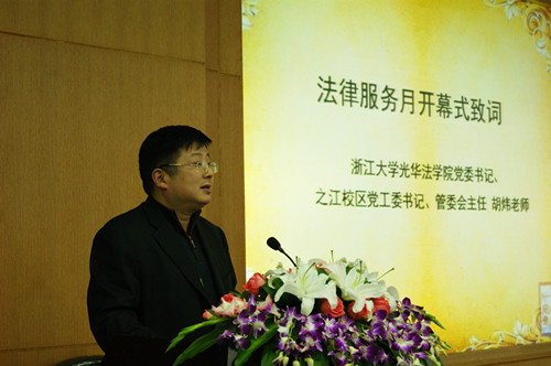 活动开始后,胡炜老师上台进行了激情洋溢的致辞,充分激发了到场的同学对于法律学科的学习热情和对国家法治前景的憧憬,随后胡炜老师宣布了2012年法律服务月正式开幕。接着,由浙江大学光华法学院法律诊所代表江海涌为现场同学介绍了法律诊所的详细情况,并表示法律诊所将积极为本次法律服务月活动提供帮助,鼓励大家在日常学习生活中遇到法律困惑可以及时联系诊所获得帮助。紧接着,浙江大学学生法学研究会会长陈嘉龙同学为大家完整地介绍了整个法律服务月的基本概况以及一系列精彩纷呈的活动。