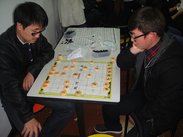 伴随室外的阴雨蒙蒙是活动室内热闹非凡的棋牌比赛,本次比赛由象棋、五子棋和“双扣”三部分组成。有八位选手参加了今晚的象棋比赛和五子棋比赛,本次比赛采取的是淘汰制。选手们在比赛中本着“切磋棋艺,以棋会友”的原则进行棋艺的切磋,这场没有硝烟的“战场”也吸引了同学们前来观战,围观的同学认真关注棋盘上的形势,为比赛同学捏了一把汗。经过激烈的角逐,多名同学脱颖而出:五子棋比赛中,金幼芳同学获得冠军,薛韵钰和张丙强分别获得亚军和季军。象棋比赛的冠亚季军则分别由魏大颂、张坚帅和牛玉龙同学斩获!伴随棋艺比赛同时进行的则是“双扣”比赛,有十位选手参加了本次的“双扣”比赛。赛场上的气氛紧张而又激烈,接二连三的平局几度让比赛陷入焦灼僵持状态,队员们凝神思考、各不相让,纷纷拿出自己的看家本领来挑战对方,经过几轮厮杀,最终徐杰-王功会组合,蔡未-杨礼丽组合,魏舒�-陈实组合分获比赛的前三名。