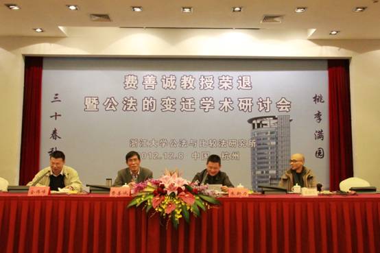 2012年12月8日,由浙江大学公法与比较法研究所主办的“费善诚副教授荣退研讨会暨公法的变迁学术研讨会”在杭州金溪山庄成功举行。本次会议是为纪念费善诚副教授光荣退休、以公法变迁为主题的论文学术研讨会。来自于社会各界包括浙江省高级人民法院、杭州市公安局、上海市公安局、厦门大学法学院、浙江大学光华法学院等的司法机关、行政机关以及高校四十多位的法律人,出席并参加了本次会议。