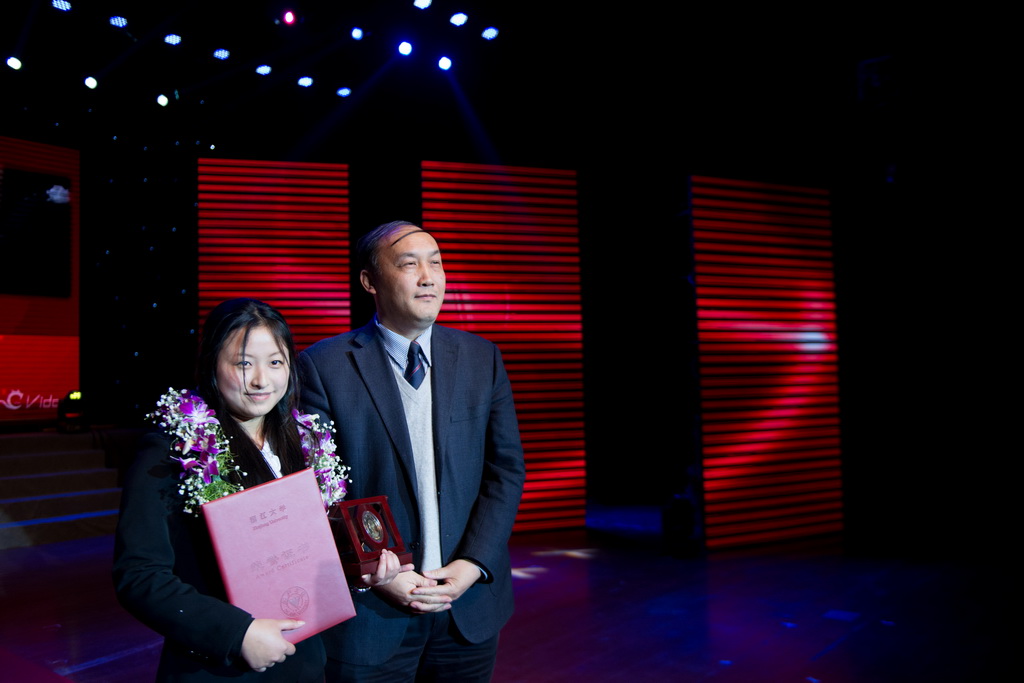 12月11日晚,浙江大学在紫金港校区小剧场举行2011—2012学年优秀学生表彰大会,对本学年获得竺可桢奖学金的12名本科生和12名研究生,第三届“浙江大学十佳大学生”获得者,以及各类校设、外设奖学金和荣誉称号的优秀学生和先进集体进行表彰。校领导金德水、杨卫、吴朝晖、来茂德、姒健敏、任少波等分别为获奖学生代表颁奖。我院博士研究生翟翌和本科生张婧雅获得校竺可桢奖学金。