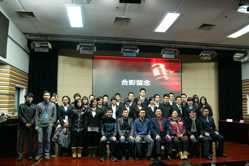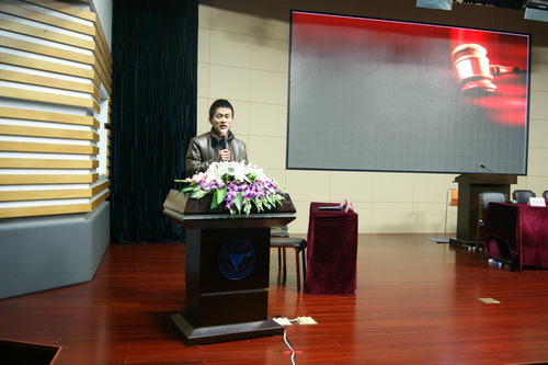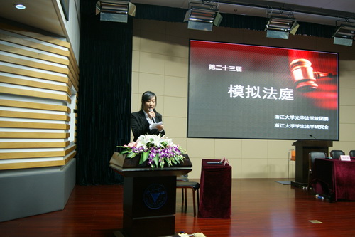 2012年12月23日晚7点,浙江大学十大品牌活动之一模拟法庭在紫金港校区临水报告厅正式开庭。本次模拟法庭活动由浙江大学光华法学院团委指导,由浙江大学学生法学研究会组织举办。本次活动成功邀请了浙江省司法厅新闻办副主任毛建一老师、浙江大学党委学工部副部长郑胜老师、浙江大学光华法学院党委副书记吴卫华老师、光华法学院兰荣杰老师、光华法学院团委书记陆飞华老师和团委副书记、学生法学研究会指导老师王书剑老师等作为嘉宾出席。同时,浙江大学学生社团联合会、浙江大学蓝田学园学生会、浙江大学光华法学院学生会、浙江大学学生国防协会、学生三农协会以及红十字会学生分会等诸多学生组织和学生社团也受邀观摩本次模拟法庭。