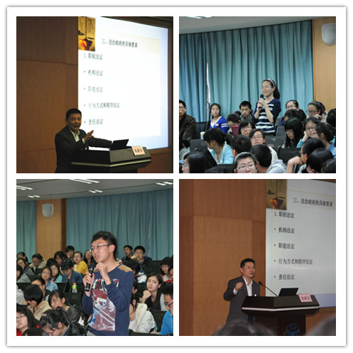 开幕式结束后,光华法学院常务副院长朱新力教授给在场师生带来了以“法治政府的中国之路”为主题的讲座,讲座由光华法学院博士生、美国爱荷华大学、杨百翰大学访问学者梁亮主持。承接法治春天的来临,朱新力分析了政府在法治化进程中出现的问题及解决方法。他通过基本背景,法治政府的判断标准,具体要求及中国法治政府道路的合法性与最佳性四个方面的具体阐述,解答了中国三十年经济奇迹的原因,进一步肯定了三十年来中国法治建设对国家发展做出的巨大贡献,在合法性与最佳性的良性互动中,未来中国梦的实现,必定是法治梦的复兴,在剥开法律教育迷雾的基础之上,他鼓励在座同学能够积极投身于中国法治建设的进程中,为中国梦的实现,做出自己的贡献。讲座结束后,在座学子与朱新力教授进行了互动交流,现场气氛热烈。