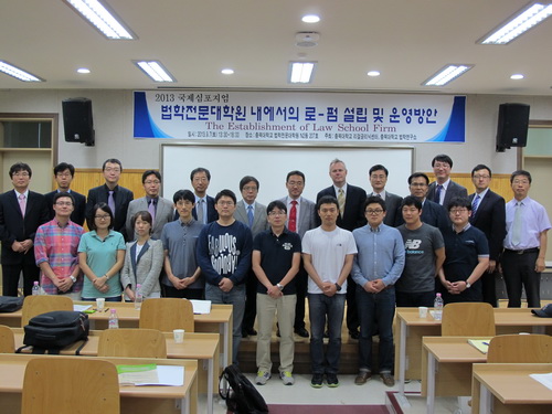 2013年9月7日,韩国忠北大学法律诊所和法学研究所共同主办的“The Establishment of Law School Firm”国际学术研讨会在韩国忠北大学举行,研讨会聚集了美国Wayfinder Management LLC、美国马里兰州巴尔的摩联邦检察院、日本早稻田大学法学院、韩国檀国大学法学院、韩国建国大学法学院、韩国国民大学法学院、韩国弘益大学法学院、韩国忠北大学法学院等机构的专家学者。