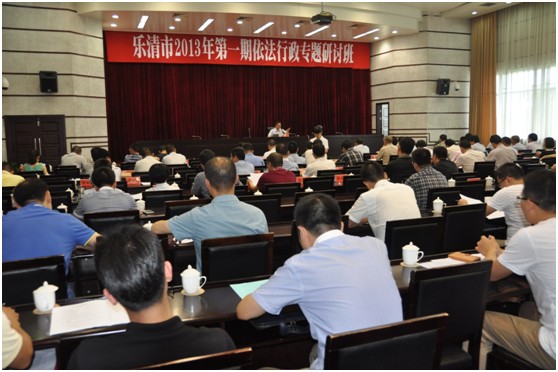 2013年7月3日,温州乐清市委组织部、政府法制办联合举办了乐清市2013年第一期领导干部依法行政专题研讨班。参加研讨班的 “行政一把手”占多数。市政府主要领导也都在百忙之中挤出时间参加了学习。本次研讨班邀请钱弘道教授作《法治评估的实验和转型期中国法治的路径》专题讲座。钱弘道教授的讲座结合案例,紧扣当前中国法治实践以及多年来自己主持的法治评估实践项目。学员们纷纷反应本次研讨班理论结合实例的教学方式,深入浅出, 切实提高了他们法治思维和行政决策的能力。