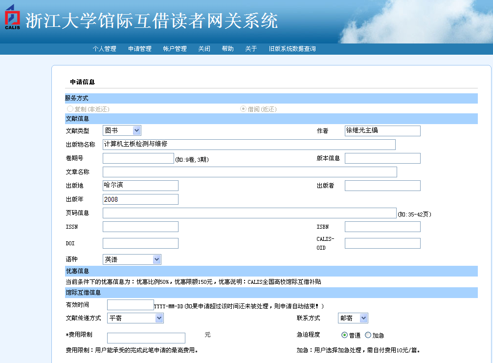 4. 进入馆际互借网关系统申请单页面,填写相关信息,完成申请的提交。