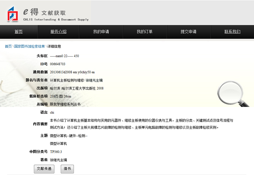 3. 在详细信息页面,点“文献传递”按钮,提交文献传递申请;点“借书”,提交馆际借书申请。