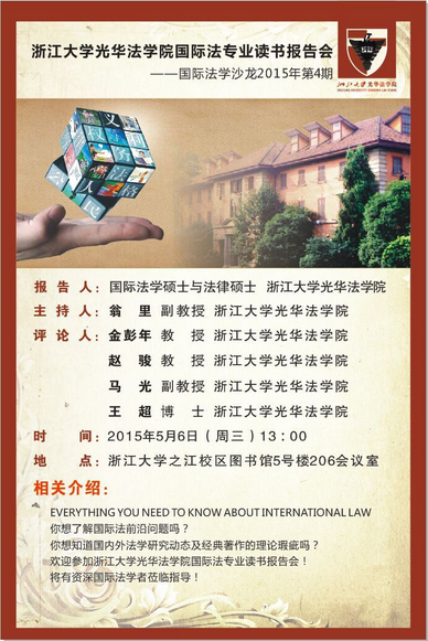 相关介绍:EVERYTHING YOU NEED TO KNOW ABOUT INTERNATIONAL LAW你想了解国际法前沿问题吗?你想知道国内外法学研究动态及经典著作的理论瑕疵吗?欢迎参加浙江大学光华法学院国际法专业读书报告会!将有资深国际法学者莅临指导!