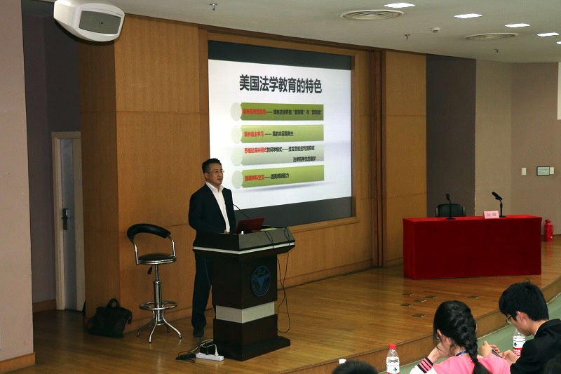 赵骏教授向同学们展示了几组自己留学时的校园照片,引起了台下同学们一阵阵羡慕的惊呼。在此铺垫下,他向同学们介绍了美国的大学在法学上独特的教育方式。相比于中国高校更多的注重理论上的教育,美国高校则更看重学生们的实际操作能力。赵骏教授还向大家介绍了一种独特的美国法律教育方式,即苏格拉底式的提问。通过对一个问题环环相扣的深入的提问来让学生更好地思考、理解问题。他也在课堂上尝试进行“温和的苏格拉底式提问”,结合中国学生的特点引进这种教育方式,以期同学们能够更加自信。