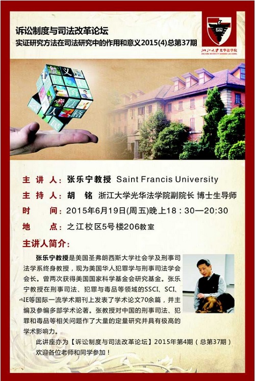 张乐宁教授是美国圣弗朗西斯大学社会学及刑事司法学系终身教授,现为美国华人犯罪学与刑事司法学会会长。曾两次获得美国国家科学基金会研究基金。张乐宁教授在刑事司法、犯罪与毒品等领域的SSCI、SCI、IE等国际一流学术期刊上发表了学术论文70余篇,并主编及参编多部学术论著。张教授对中国的刑事司法、犯罪和毒品等相关问题作了大量的定量研究并具有极高的学术影响力。